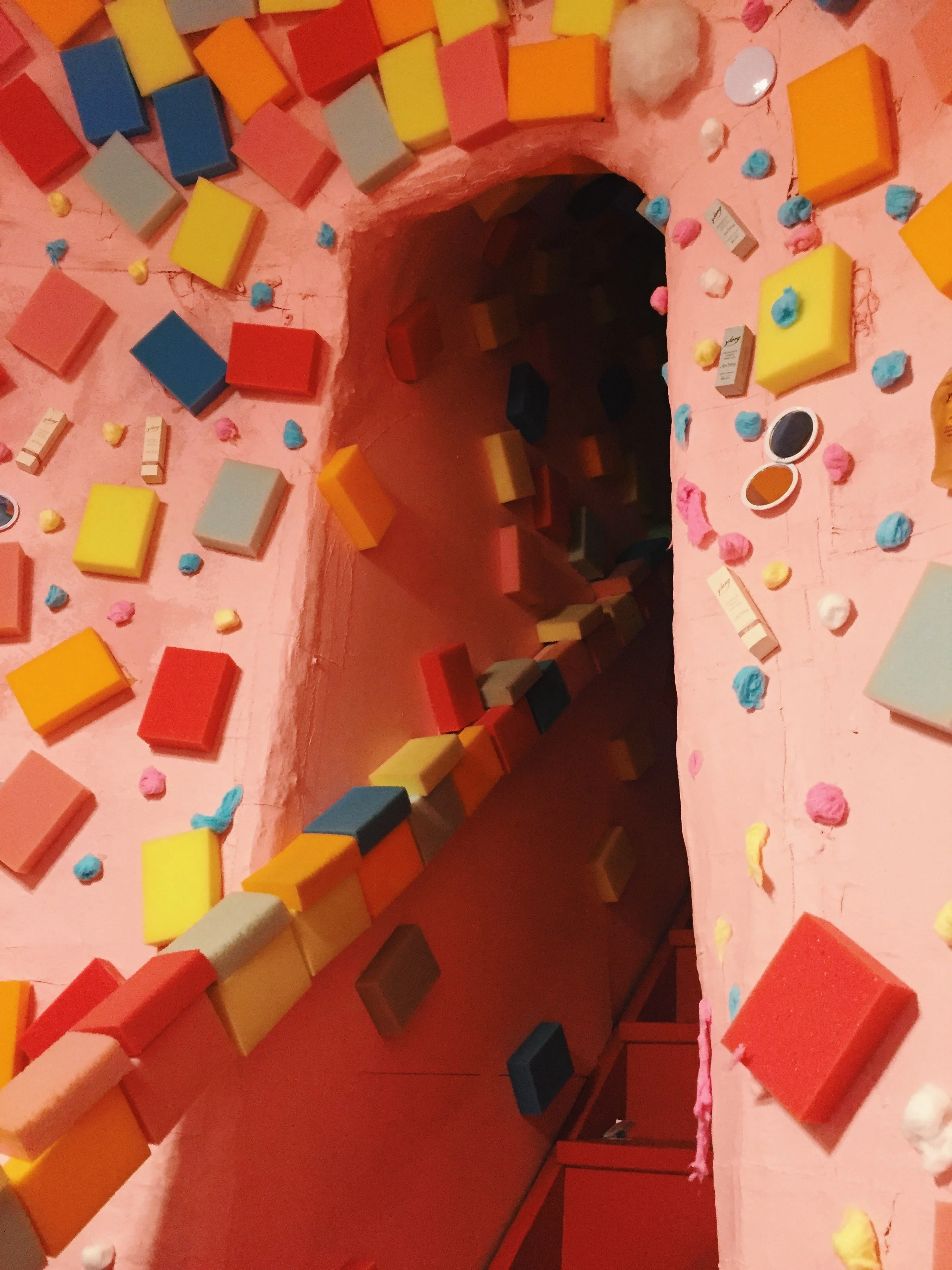 Marta Munijín’s Menesunda Reloaded is a fun-house fantasyland inspired by the artist’s hometown of Buenos Aires. Waliking through it, I thought it felt very much like a pop-up, instagram-friendly “museum.” Later, I learned it was actually originally created in 1965, so it is a work that has proven to be ahead of its time. Only a few people can enter at once, and you are led through a specific journey, experiencing a number of different spaces and scenarios. As you initially walk up a set of stairs, there are TV screens which display a live feed of your face, a sign that you are being watched (a comment on the surveillance state, which contrasts the general sensory amusement of the exhibition). Different worlds included the inside of a stark-white fridge (with an actual drop in temperature), a room of stuffed tubular plastic entities resembling organs, and a soft room made of mattresses and styrofoam. At one point there is a bedroom scene with actors posing as a couple reading in bed (again suggesting surveillance or voyeurism as a running theme).